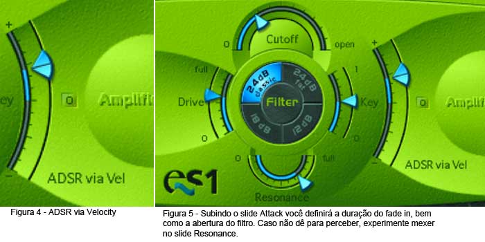 Assim como outros sintetizadores - analógicos, inclusive -, o ES1 oferece a possibilidade de modular as frequências - determinadas por você no slide Cutoff do filtro - através do envelope ADSR. Experimente desabiltar o Decay e o Sustain, selecionando o primeiro botão AGateR. Agora, um pouco mais à esquerda do slide Amplifier, mexa no ADSR via Velocity (figura 4) e no Cutoff, depois de manter os slides Decay e Sustain relativamente elevados.